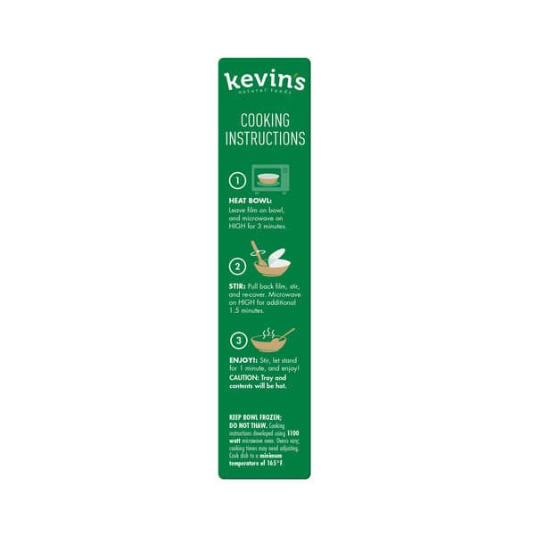 Cooking Instructions: 1. Heat Bowl: Leave film on bowl, and microwave on high for 3 minutes. 2. Stir: Pull back film, stir, and re-cover. Microwave on high for additional 1.5 minutes. 3. Enjoy!: Stir, let stand for 1 minute, and enjoy! Caution: Tray and contents will be hot. Keep bowl frozen; Do not thaw. Cooking instructions developed using 1100 watt microwave oven. Ovens vary; cooking times may need adjusting. Cook dish to a minimum temperature of 165 degrees F.