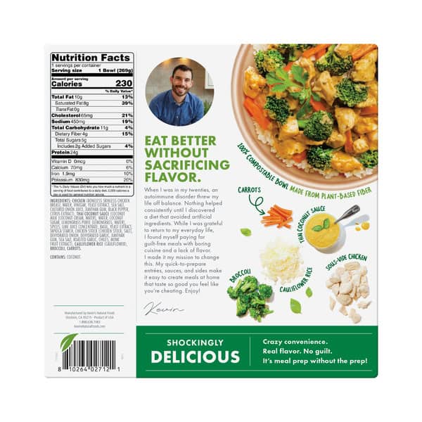 Chicken (boneless Skinless Chicken Breast, Water, Vinegar, Yeast Extract, Sea Salt, Cultured Onion Juice, Xanthan Gum, Black Pepper, Citrus Extract), Thai Coconut Sauce (coconut Milk [coconut Cream, Water], Water, Coconut Sugar, Lemongrass Puree [lemongrass, Water], Spices, Lime Juice Concentrate, Basil, Yeast Extract, Chicken Stock [chicken Stock, Salt], Dehydrated Onion, Dehydrated Garlic, Xanthan Gum, Sea Salt, Roasted Garlic, Tapioca Starch, Chiles, Monk Fruit Extract), Cauliflower Rice (cauliflower), Broccoli, Carrots.