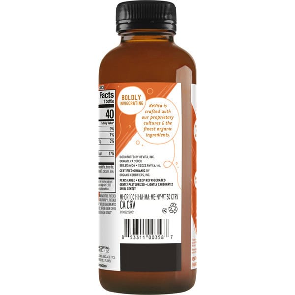 Naturally flavored with other natural flavors. 35 calories per serving. USDA Organic. Gluten free. Vegan. Certified organic by Organic Certifiers, Inc. Certified Organic Caffeine: 40 mg per serving. Organic Acids (Gluconic and Acetic): 1200 mg per serving. Active cultures. Live probiotics. Organic & energizing. Contains 0% juice. We believe health and wellness begins at your core. Kevita Master Brew Kombucha is fermented with our proprietary Kombucha tea culture. Crafted with billions of live probiotics, organic acids, and the finest ingredients, Master Brew Kombucha comes in a variety of bold, delicious flavors that are revitalizing to the core. Fermented Kombucha culture. Non-dairy. NA: Verified non-alcoholic. Non GMO Project verified. nongmoproject.org. www.kevita.com. Facebook. Twitter. Instagram. Please recycle. Contains less than 0.5% alc by vol.