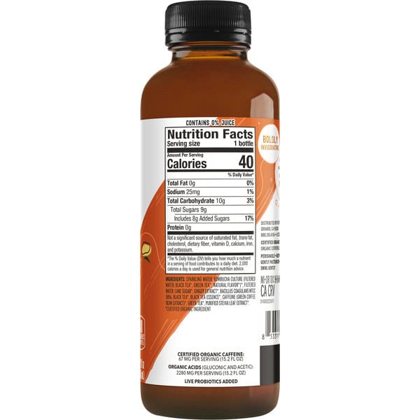 Sparkling Water, Kombucha Culture (filtered, Water, Black Tea*, Green Tea*, Natural Flavor*)*, Filtered Water, Cane Sugar*, Ginger Extract*, Bacillus Coagulans Mtcc 5856, Black Tea*, Black Tea Essence*, Caffeine (green Coffee Bean Extract)*, Green Tea*, Purified Stevia Leaf Extract*, *certified Organic Ingredient