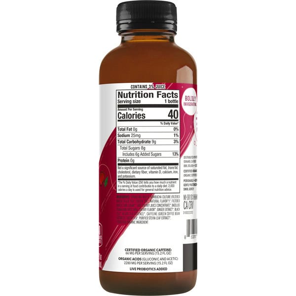Purified Water, Kombucha Culture (bacillus Coagulans Lactospore Mtcc 5856, Lactobacillus Rhamnosus)*, Cane Sugar*, Tart Cherry Juice Concentrate*, Cherry Flavor, Ginger Extract*, Black Tea*, Black Tea Essence*, Green Coffee Bean Extract (caffeine)*?, Green Tea*, Reb A (stevia Leaf Extract)*.