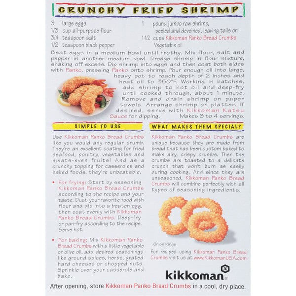 Simple to Use: Use Kikkoman Panko Bread Crumbs like you would any regular crumb. They’re an excellent coating for fried seafood, poultry, vegetables and meats – even fruits! And as a crunchy topping for casseroles and baked foods, they’re unbeatable. For Frying: Start by seasoning Kikkoman Panko Bread Crumbs according to the recipe and your taste. Dust your favorite food with flour and dip into a beaten egg, then coat evenly with Kikkoman Panko Bread Crumbs. Deep-fry or pan-fry according to the recipe. Serve hot. For Baking: Mix Kikkoman Panko Bread Crumbs with a little vegetable or olive oil, add desired seasonings like ground spices, herbs, grated hard cheeses or chopped nuts. Sprinkle over your casserole and bake.