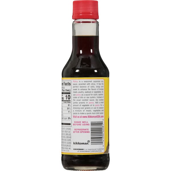 Citrus seasoned dressing & sauce. Ponzu is a seasoned Japanese soy sauce, accented with citrus. It has the perfect balance of salty, tangy and sweet to enhance the flavors of broiled meats, poultry, seafood or vegetables. Or, use ponzu as a sauce for sushi, sashimi, cubes of tofu or raw oysters. Instead of the usual cocktail sauce, dip cooked jumbo prawns in ponzu. Add a small amount of vegetable oil to ponzu for a dressing over greens or use to season a mixture of meats, vegetables and pasta to make a quick main dish salad.