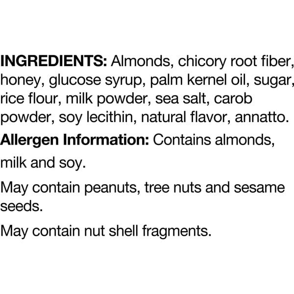 Almonds, Chicory Root Fiber, Honey, Glucose Syrup, Palm Kernel Oil, Sugar, Rice Flour, Milk Powder, Sea Salt, Carob Powder, Soy Lecithin, Natural Flavor, Annatto