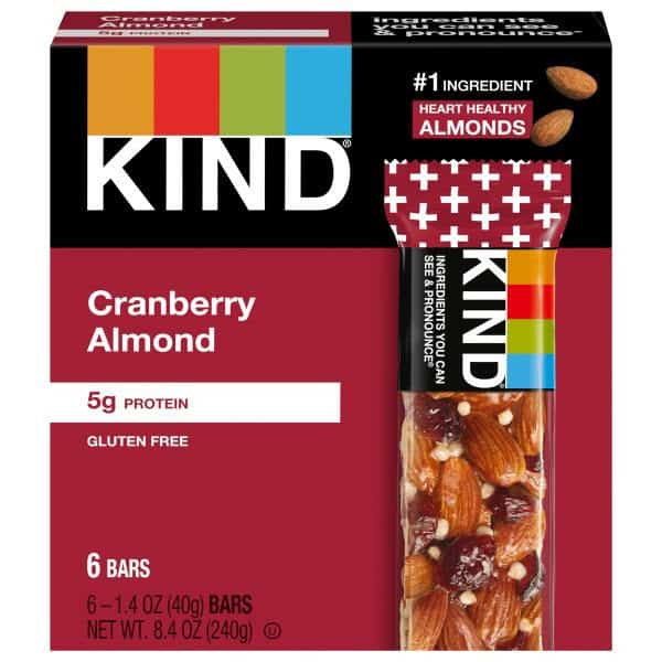KIND Cranberry Almond bars are satisfying gluten free bars packed with nuts and cranberries that you can take anywhere. These KIND nut bars lead with heart healthy almonds as the #1 ingredient. This healthy snack bar combines quality ingredients like almonds, cranberry and honey to deliver a delicious taste with a little crunch. These snack bars come packed as individually wrapped snacks for a convenient option that makes eating healthy easier. It’s the perfect nutrient-dense pick-me-up when life gets in the way. KIND bars Cranberry Almond contain 5 grams protein and are a good source of fiber*. This KIND nut bar is also gluten free, has a low glycemic index, and is made without genetically engineered ingredients. *Contains 12g of fat per bar