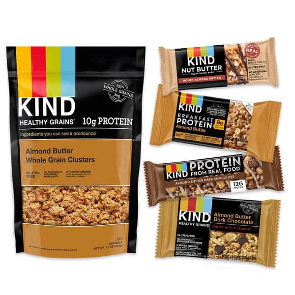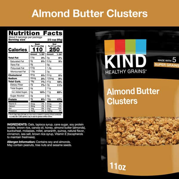 KIND HEALTHY GRAINS Almond Butter granola clusters are an all-in-one, convenient, hand-to-mouth, protein packed snack mix. These wholesome clusters 10 grams of protein and 36 grams of whole grains per serving, making this a satisfying, healthy snack. KIND HEALTHY GRAINS Almond Butter granola clusters combine five super grains – oats, millet, buckwheat, amaranth, and quinoa – and delicious almond butter for a healthy, gluten free snack mix. Sprinkle this convenient snack over yogurt, cereal or smoothies for a whole grain, protein packed addition to your breakfast, or enjoy this gluten free granola anytime throughout the day. These granola clusters are low sodium snacks as well as a good source of fiber*. These gluten free snacks are made without genetically engineered ingredients. *Contains 5 grams of fat per serving