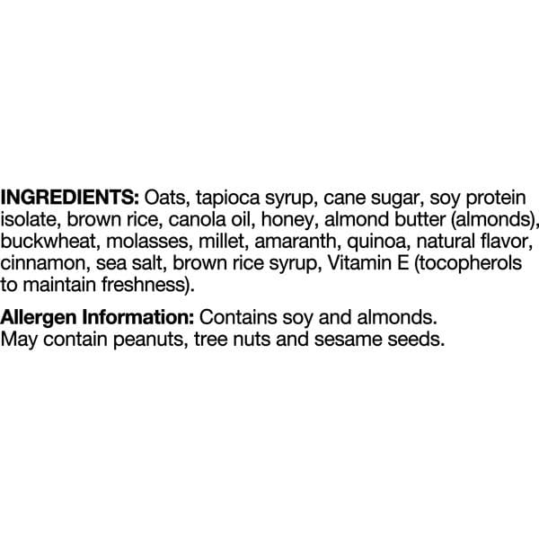 Oats, Tapioca Syrup, Cane Sugar, Soy Protein Isolate, Brown Rice, Canola Oil, Honey, Almond Butter (almonds), Oat Flour, Buckwheat, Molasses, Millet, Amaranth, Quinoa, Natural Flavor, Brown Rice Syrup, Sea Salt, Cinnamon, Vitamin E (tocopherols To Maintain Freshness).