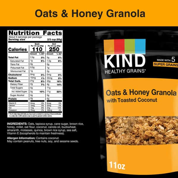 KIND HEALTHY GRAINS Oats & Honey Granola with Toasted Coconut are an all-in-one, convenient, hand-to-mouth healthy snack mix. These 100% whole grain clusters are made with 5 super grains – oats, millet, buckwheat, amaranth, quinoa – and include honey and toasted coconut for a healthy, gluten free snack mix. Sprinkle this convenient snack over yogurt, cereal or smoothies for a whole grain addition to your breakfast, or enjoy this gluten free granola anytime throughout the day. These wholesome clusters are low sodium snacks as well as a good source of fiber*. These gluten free snacks are made without genetically engineered ingredients. *Contains 5 grams of fat per serving
