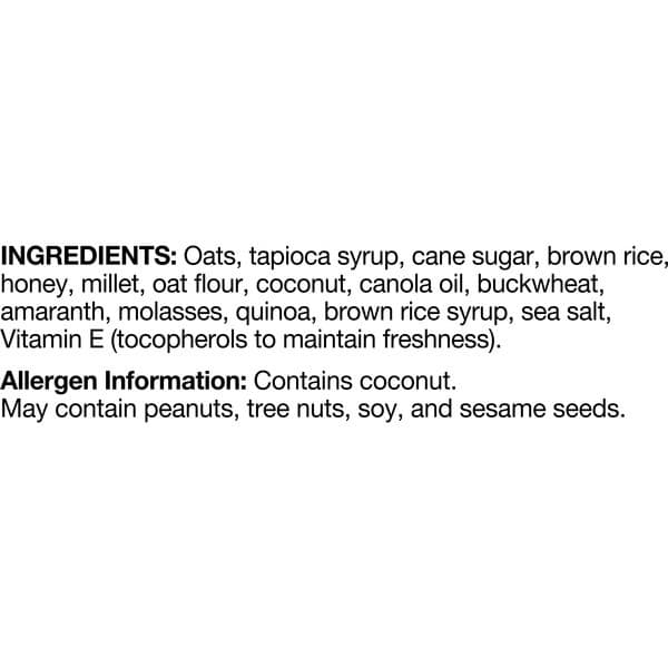 Oats, Tapioca Syrup, Cane Sugar, Brown Rice, Honey, Millet, Oat Flour, Coconut, Canola Oil, Buckwheat, Amaranth, Molasses, Quinoa, Brown Rice Syrup, Sea Salt, Vitamin E (tocopherols To Maintain Freshness)