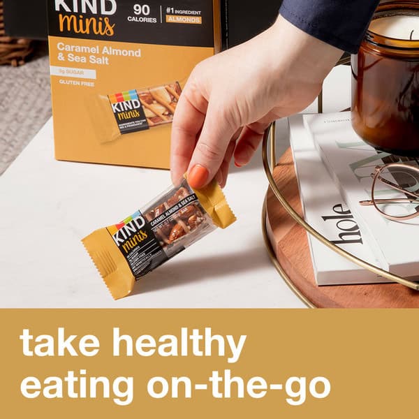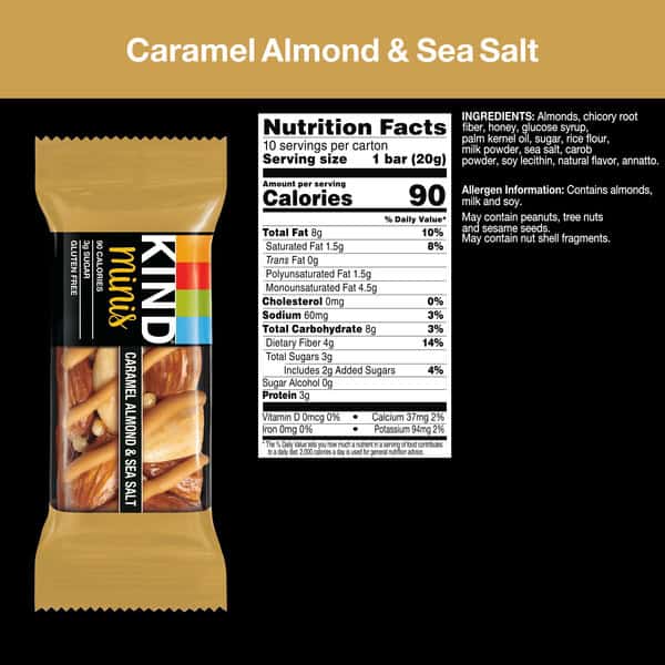 KIND Caramel Almond & Sea Salt Minis are bite-sized versions of a classic KIND flavor. These mini, gluten free bars offer the indulgent taste of caramel, but in a portion-controlled treat format. With almonds as the #1 ingredient, KIND Minis are a nutritionally dense, healthy snack that makes eating healthy easier. These individually wrapped snacks are great for any occasion, whether you need an afternoon treat for the office or kosher snacks to satisfy your taste buds. Each KIND Caramel Almond & Sea Salt Mini contains 90 calories and 3 grams of sugar. KIND Minis bars are also gluten free, low sodium snacks that have a low glycemic index, and are made without genetically engineered ingredients.