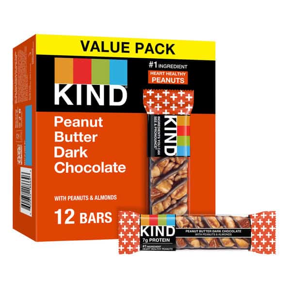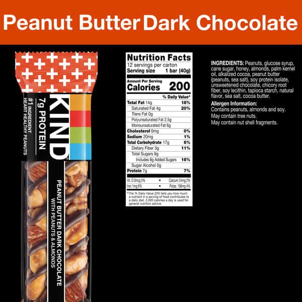 KIND Peanut Butter Dark Chocolate bars are satisfying gluten free bars packed with nuts and the taste of dark chocolate that you can take anywhere. These KIND nut bars lead with heart healthy peanuts as the #1 ingredient. This healthy snack bar combines quality ingredients like peanuts, almonds and dark chocolate to deliver a delicious taste with a little crunch. These snack bars come packed as individually wrapped snacks for a convenient option that makes eating healthy easier. It’s the perfect nutrient-dense pick-me-up when life gets in the way. KIND bars Peanut Butter Dark Chocolate contain 7 grams of protein and are a good source of fiber*. This KIND nut bar is also gluten free, has a low glycemic index, and is made without genetically engineered ingredients. *Contains 14g of fat per bar