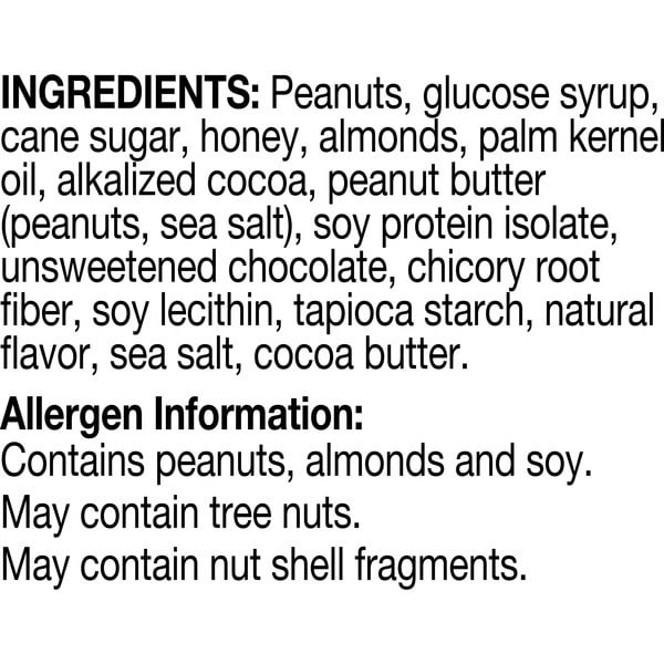 Peanuts, Glucose Syrup, Sugar, Honey, Palm Kernel Oil, Almonds, Peanut Butter (peanuts, Sea Salt), Soy Protein Isolate, Unsweetened Chocolate, Alkalized Cocoa, Chicory Root Fiber, Soy Lecithin, Tapioca Starch, Sea Salt, Natural Flavor, Cocoa Butter