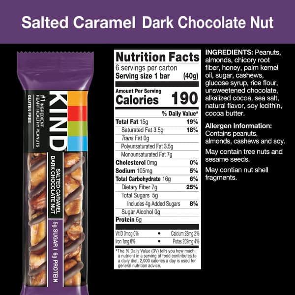 KIND Salted Caramel Dark Chocolate Nut bars are satisfying gluten free bars packed with nuts and the taste of dark chocolate that you can take anywhere. These KIND nut bars lead with heart healthy peanuts as the #1 ingredient. This healthy snack bar combines quality ingredients like almonds, dark chocolate and caramel to deliver a delicious taste with a little crunch. These snack bars come packed as individually wrapped snacks for a convenient option that makes eating healthy easier. It’s the perfect nutrient-dense pick-me-up when life gets in the way. KIND Salted Caramel Dark Chocolate Nut bars contain 5 grams of sugar, 6 grams of protein, and are high in fiber*. This KIND nut bar is also gluten free, has a low glycemic index, and is made without genetically engineered ingredients. *Contains 15g of fat per bar