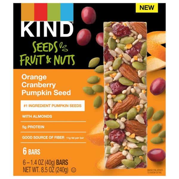 KIND Seeds Fruit & Nuts Orange Cranberry Pumpkin Seed bars are gluten-free bars that pair citrusy orange zest and tart cranberries with chewy pumpkin seeds, sunflower seeds, and crunchy almonds, making them great snacks for anytime and anywhere. Each satisfying flavor of KIND Seeds Fruit & Nuts snack bars combines the nutrient-dense #1 ingredient of either pumpkin seeds or sunflower seeds with real fruit, plus nuts, for a tasty snack bar with a little crunch. Individually wrapped bars that are ideal for grab-and-go snacks between meals, these Seeds Fruit & Nuts KIND bars are a tasty take on KIND’s classic nut bars, with fruity flavors that make eating seeds, fruit and nuts delicious and convenient. When you are looking for a snack with real, wholesome ingredients and don’t want to sacrifice taste, grab a KIND Seeds Fruit & Nuts bar. These Orange Cranberry Pumpkin Seed KIND bars are a good source of fiber* snack, contain 5 grams of protein, gluten free, and Non-GMO Project Verified. *Contains 11 grams of fat per bar