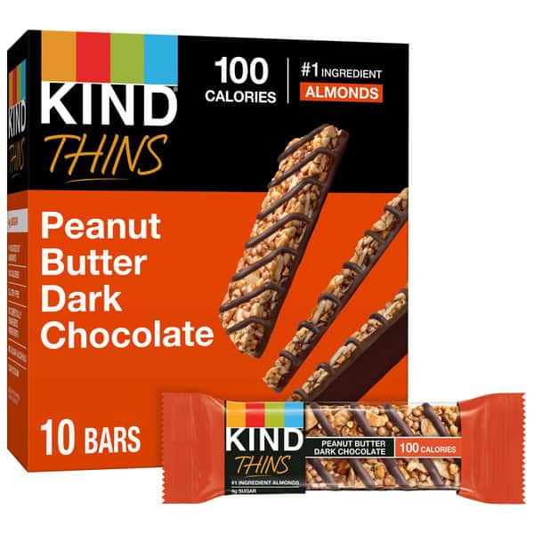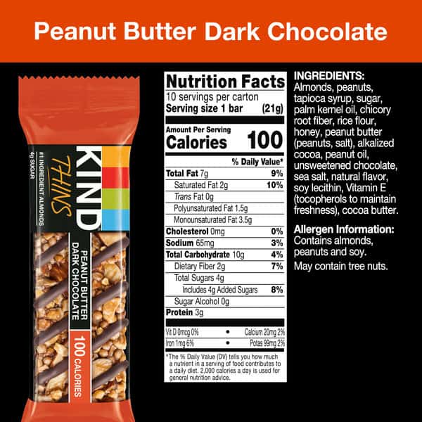KIND THINS Peanut Butter Dark Chocolate bars are a thinner take on your favorite KIND bar. Each bar is crafted with sliced almonds and roasted peanuts for a chewier crunch and a lighter bite. With almonds as the #1 ingredient, these gluten free bars have a thin layer of sliced almonds and peanuts with a chocolatey coating and drizzle for the ultimate snack bar. These gluten free snack bars are made with quality ingredients, and are great for any occasion, whether you need nutrition bars for the office or a nutritious snack for a busy day. A convenient, nutrient dense, grab-and-go snack, KIND crunchy thin granola bars make eating healthy easier. Each gluten free bar contains 4 grams of sugar, 100 calories, and is made without genetically engineered ingredients.