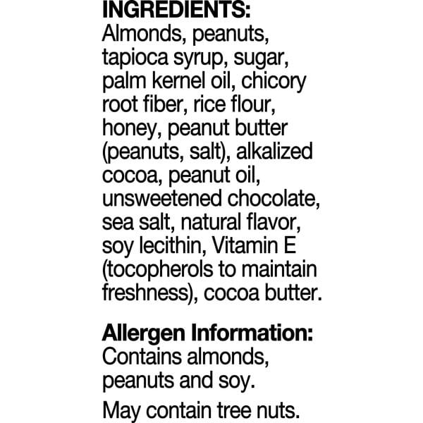 Almonds, Peanuts, Tapioca Syrup, Cane Sugar, Palm Kernel Oil, Brown Rice Flour, Chicory Root Fiber, Honey, Peanut Butter (peanuts, Sea Salt), Alkalized Cocoa, Peanut Oil, Unsweetened Chocolate, Sea Salt, Natural Flavor, Soy Lecithin, Vitamin E (mixed Tocopherols For Freshness), Cocoa Butter