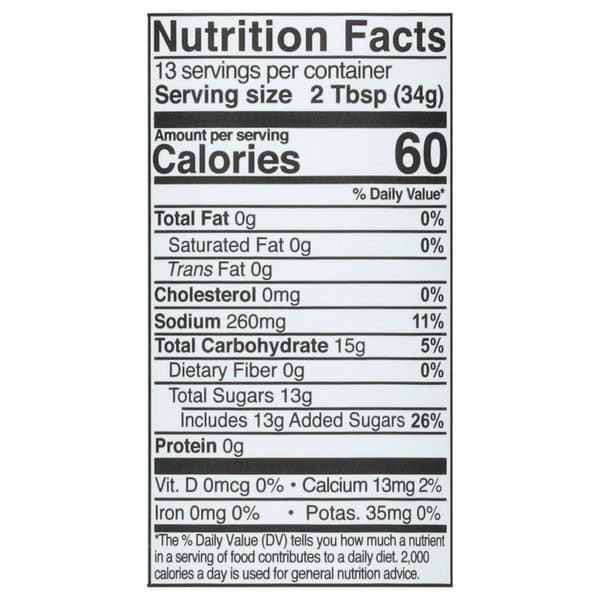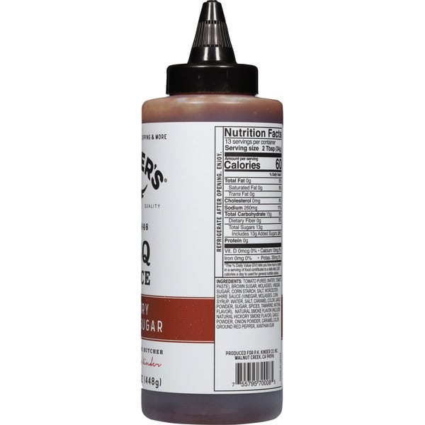Tomato Puree (water, Tomato Paste), Brown Sugar, Molasses, Vinegar, Sugar, Corn Starch, Salt, Worcestershire Sauce (vinegar, Molasses, Corn Syrup, Water, Salt, Caramel Color, Garlic Powder, Sugar, Spices, Tamarind, Natural Flavor), Natural Smoke Flavor (includes Natural Hickory Smoke Flavor), Garlic Powder, Onion Powder, Caramel Color, Ground Red Pepper, Xanthan Gum