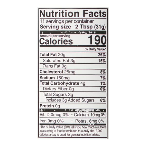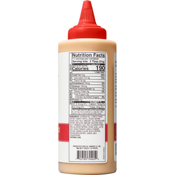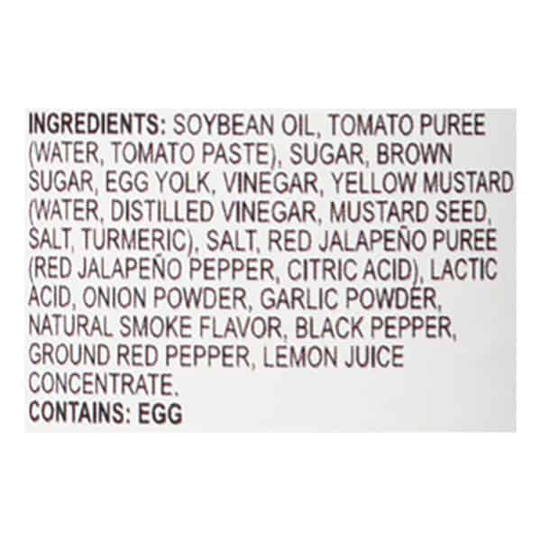 Soybean Oil, Tomato Puree (water, Tomato Paste), Sugar, Brown Sugar, Egg Yolk, Vinegar, Yellow Mustard (water, Distilled Vinegar, Mustard Seed, Salt, Turmeric), Salt, Red Jalapeño Puree Red Jalapeño Pepper, Citric Acid), Lactic Acid, Onion Powder, Garlic Powder, Natural Smoke Flavor, Black Pepper, Ground Red Pepper, Lemon Juice Concentrate.