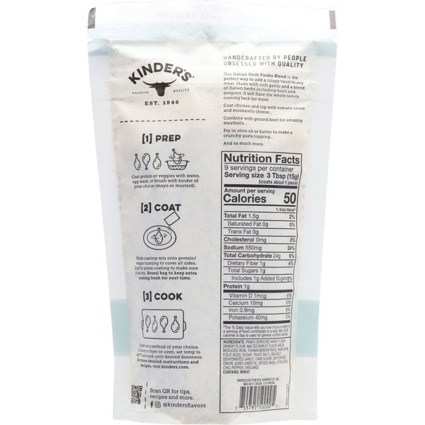 Panko (enriched Wheat Flour [wheat Flour, Malted Barley Flour, Niacin, Reduced Iron, Thiamin Mononitrate, Riboflavin, Folic Acid], Sugar, Yeast, Salt), Sea Salt, Dehydrated Garlic, Cane Sugar, Dehydrated Onion, Sunflower Oil, Spices, Basil, Citric Acid, Chili Pepper, Oregano.