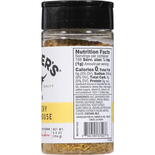 Salt, Dehydrated Onion, Dehydrated Garlic, Spices, Red Bell Pepper, Dextrose, Parsley, Maltodextrin, Yeast Extract, Sunflower Oil, Natural Butter Flavor, Turmeric Extract (color), Natural Flavor.