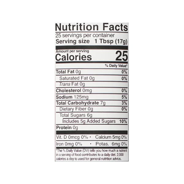 Tomato Puree (water, Tomato Paste), Brown Sugar, Peach Puree (peaches, Ascorbic Acid, Citric Acid), Bourbon Reduction, Vinegar, Sugar, Corn Starch, Salt, Natural Smoke Flavor, Worcestershire Sauce (vinegar, Molasses, Corn Syrup, Water, Salt, Caramel Color, Garlic Powder, Sugar, Spices, Tamarind, Natural Flavor), Garlic Powder, Onion Powder, Ground Red Pepper, Caramel Color, Natural Flavors, Xanthan Gum.