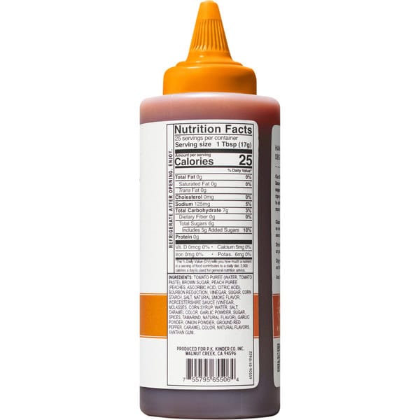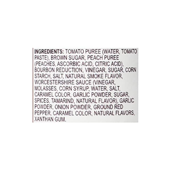 Tomato Puree (Water, Tomato Paste), Brown Sugar, Peach Puree (Peaches, Ascorbic Acid, Citric Acid), Bourbon Reduction, Vinegar, Sugar, Corn Starch, Salt, Natural Smoke Flavor, Worcestershire Sauce (Vinegar, Molasses, Corn Syrup, Water, Salt, Caramel Color, Garlic Powder, Sugar, Spices, Tamarind, Natural Flavor), Garlic Powder, Onion Powder, Ground Red Pepper, Caramel Color, Natural Flavors, Xanthan Gum.