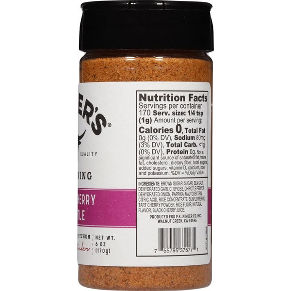 Brown Sugar, Sugar, Sea Salt, Dehydrated Garlic, Spices, Chipotle Pepper, Dehydrated Onion, Paprika, Maltodextrin, Citric Acid, Rice Concentrate, Sunflower Oil, Tart Cherry Powder, Rice Flour, Natural Flavor, Black Cherry Juice.