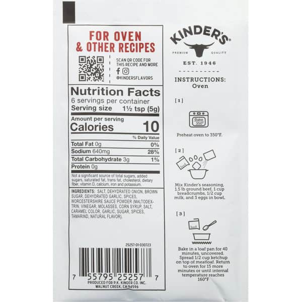 Instructions: Oven: 1. Preheat oven to 350 degrees F. 2. Mix Kinder’s seasoning, 1.5 lb ground beef, 1 cup breadcrumbs, 1/2 cup milk, and 3 eggs in bowl. 3. Bake in a loaf pan for 40 minutes, uncovered. Spread 1/2 cup ketchup on top of meatloaf. Return to oven for 15 more minutes or until internal temperature reaches 160 degrees F.