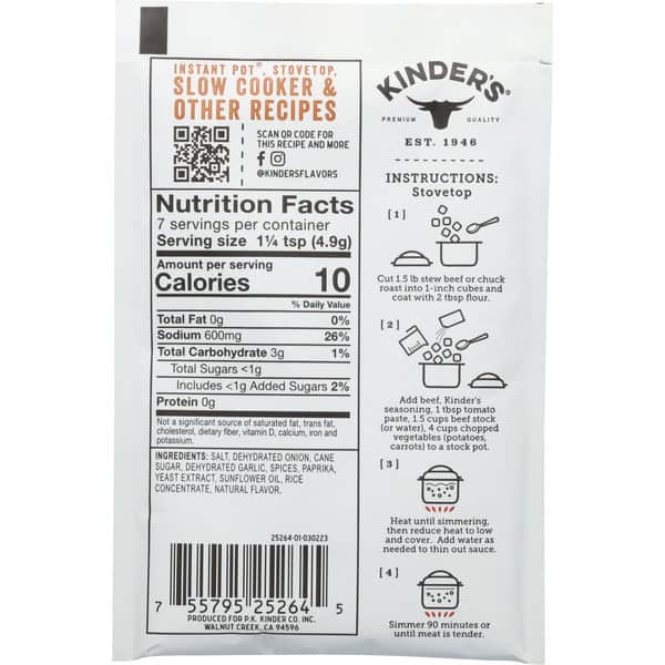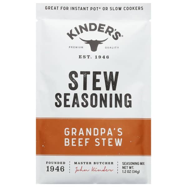 Instructions: Instant Pot: 1. Cut 1.5 lb stew beef or chuck roast into 1-inch cubes and coat with 2 tbsp flour. 2. Add beef, Kinder’s seasoning, 1 tbsp tomato paste, 1 cup beef stock (or water), and 4 cups chopped vegetables (potatoes, carrots) to Instant Pot. 3. Cook on high pressure for 40 minutes, release pressure and cool 10 minutes. Instructions: Slow Cooker: 1. Cut 1.5 lb stew beef or chuck roast into 1-inch cubes and coat with 2 tbsp flour. 2. Add beef, Kinder’s seasoning, 1 tbsp tomato paste, 1.5 cup beef stock (or water), and 4 cups chopped vegetables (potatoes, carrots) to slow cooker. 3. Cook on low for 8 hours.