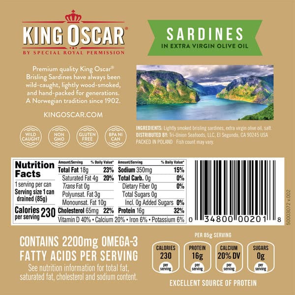 King Oscar is the #1 selling sardine in America. We feature only gourmet quality, small brisling sardines, wild caught in Norway’s ice cold fjords and coastal waters, lightly wood smoked, and hand-packed in extra virgin olive oil for the freshest, best taste. Our sardines in extra virgin olive oil are high in protein and feature heart-healthy omega-3s plus vitamins, and minerals–perfect for keto, paleo, and Mediterranean diets. With a no-mess, easy-open, ring pull lid, you can enjoy these canned sardines in olive oil at home or on-the-go. They are delicious straight from the can, on a cracker, or elevate your favorite recipes like pasta, salads, favorite rice dish and sandwiches.