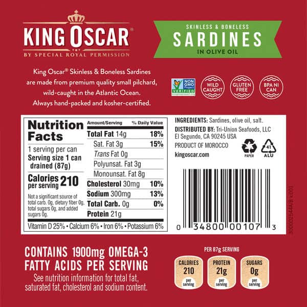 King Oscar is the #1 selling sardine in America. We feature only gourmet quality, small sardines, wild caught, hand-filleted to remove skin and bones, and hand-packed in olive oil for the freshest, best taste. Our sardines in olive oil are high in protein and feature heart-healthy omega-3s plus vitamins, and minerals–perfect for keto, paleo, and Mediterranean diets. With a no-mess, easy-open, ring pull lid, you can enjoy these canned sardines in olive oil at home or on-the-go. They are delicious straight from the can, on a cracker, or elevate your favorite recipes like pasta, salads, favorite rice dish and sandwiches.
