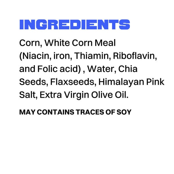 Corn, White Corn Meal ( Niacin, iron, Thiamin, Riboflavin, and Folic acid) , Water, Flaxseeds, Chia Seeds, Himalayan Pink Salt, Extra Virgin Olive Oil.