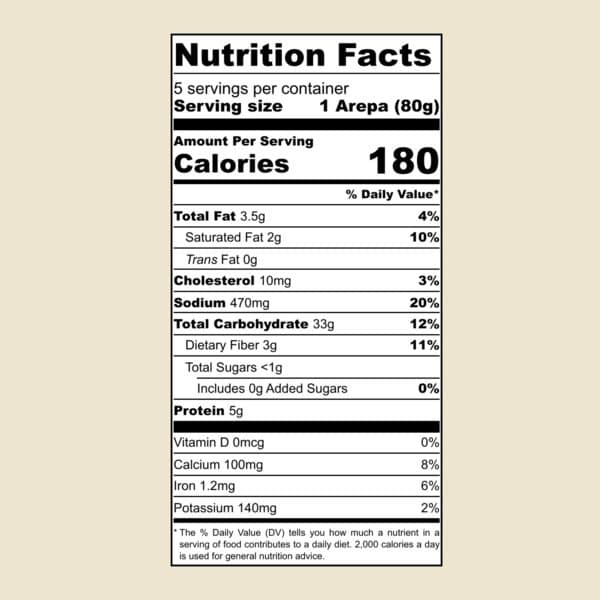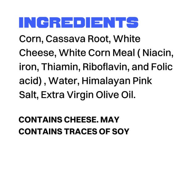 Corn, Cassava Root, White Cheese, White Corn Meal ( Niacin, iron, Thiamin, Riboflavin, and Folic acid) , Water, Himalayan Pink Salt, Extra Virgin Olive Oil.