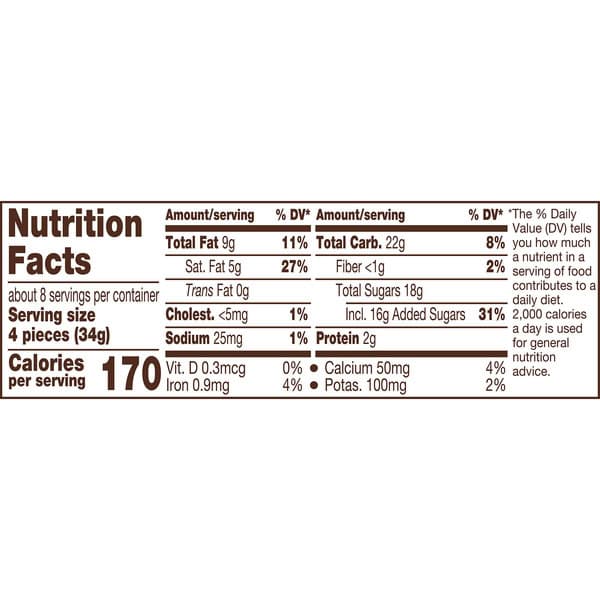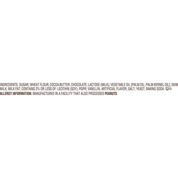 Sugar; Wheat Flour; Cocoa Butter; Chocolate; Lactose (milk); Vegetable Oil [palm Oil; Palm Kernel Oil]; Skim Milk; Milk Fat; Contains 2% Or Less Of: Lecithin (soy); Pgpr; Vanillin, Artificial Flavor; Salt; Yeast; Baking Soda.