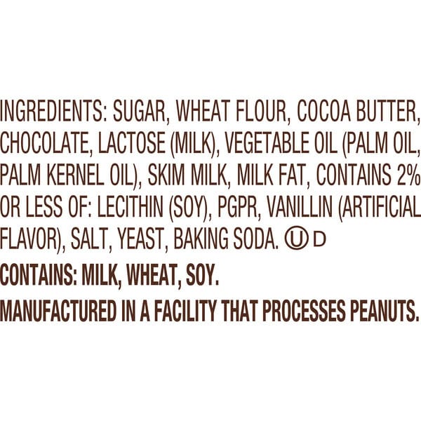 Sugar, Wheat Flour, Cocoa Butter, Chocolate, Lactose (milk), Vegetable Oil (palm Oil, Palm Kernel Oil), Skim Milk, Milk Fat, Contains 2% Or Less Of: Lecithin (soy), Pgpr, Vanillin (artificial Lavor), Salt, Yeast, Baking Soda