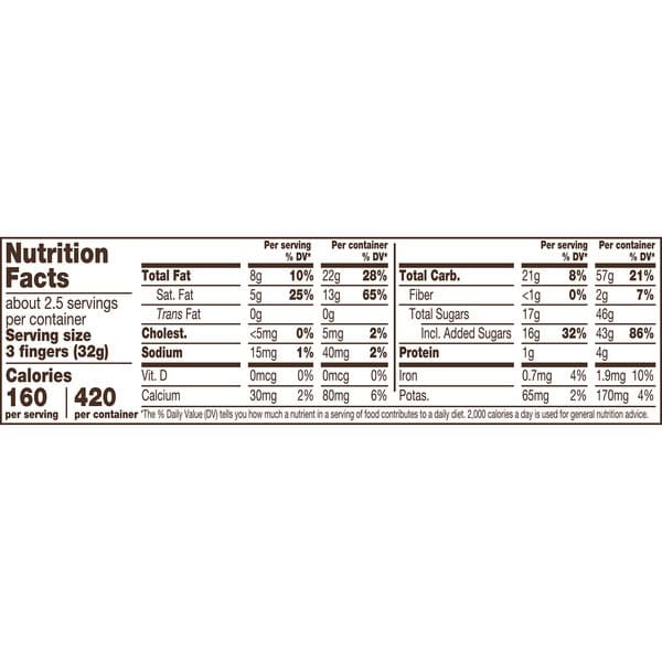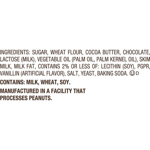 Sugar; Wheat Flour; Nonfat Milk; Cocoa Butter; Chocolate; Palm Kernel Oil; Milk Fat; Lactose (milk); Contains 2% Or Less Of: Lecithin (soy); Pgpr, Emulsifier; Vanillin, Artificial Flavor; Salt; Yeast; Baking Soda.