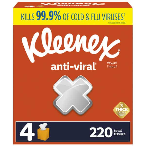 • 4 boxes of Kleenex Anti-Viral Facial Tissues, 3-Ply, 55 tissues per box (220 tissues total)