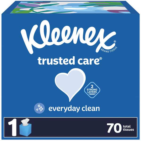 • 1 cube box of Kleenex Trusted Care Facial Tissues, 2-Ply, 70 tissues per box (70 tissues total)
