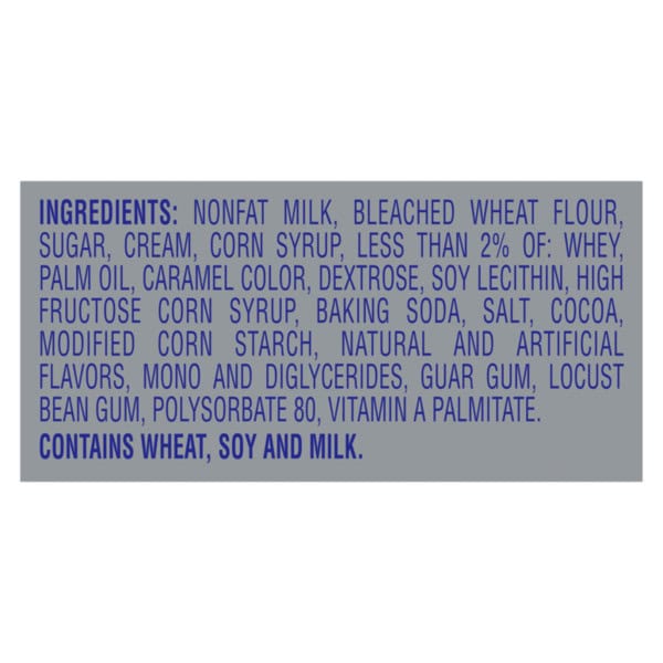 Nonfat Milk, Sugar, Bleached Wheat Flour, Corn Syrup, Cream, Corn Syrup Solids, Whey, Palm Oil, Caramel Color, Less Than 1% Of: Dextrose, Baking Soda, Cocoa, High Fructose Corn Syrup, Modified Corn Starch, Salt, Soy Lecithin, Mono And Diglycerides, Locust Bean Gum, Guar Gum, Natural And Artificial Flavor, Vitamin A Palmitate, Carrageenan