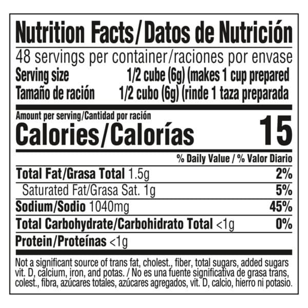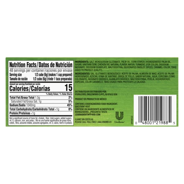 Turn up the flavor in your dishes with Knorr Chicken Flavor Bouillon Cube! This bouillon cube blends flavors of chicken, onion, parsley, and other spices. Knorr Chicken Flavor Bouillon Cube is made with real vegetables and spices for authentic flavor. The classic flavor of this chicken bouillon cube is the ultimate taste enhancer for a wide range of recipes. Add the authentic Knorr flavor to all your dishes with this bouillon cube! Knorr Cube Bouillon is an essential pantry item with everyday use. Knorr Cube Bouillon delivers a strong flavor profile, and the cube format allows for the perfect dosage of flavor every time. 1 bouillon cube is the equivalent of 1 tablespoon of granulated bouillon. Each pack of this Knorr Chicken Flavor Bouillon contains six bouillon cubes that make thirteen cups of broth. Use Knorr Chicken Flavor Bouillon Cube to enhance flavor in any recipe, like the delicious Black Bean Salad, as well as in other types of dishes like soups, stews, sauces, rice, vegetables, pastas, and other chicken dishes. Knorr Cube Bouillon comes in additional sizes and great flavors including Tomato Chicken, Beef, Shrimp, Ham, and Reduced Sodium Chicken, so you can be sure to find the Latin flavors your family will love. Knorr believes that good food matters, and everyday meals can be just as magical as special occasions. Whether it’s creating high-quality products, offering simple chef-developed recipes, or supporting organizations and initiatives that provide access to healthy foods, Knorr remains committed to its long history of making good food available to everyone. Knorr sources high-quality ingredients to create a wide range of delicious side dishes, bouillons, sauces, gravies, soups, and seasonings enjoyed by families everywhere.
