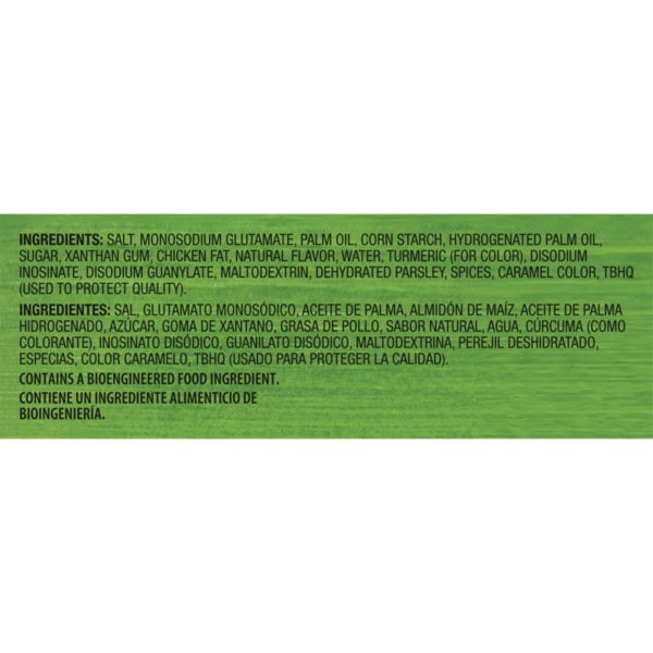 Salt, Palm Oil, Monosodium Glutamate, Corn Starch, Hydrogenated Palm Oil, Sugar, Cooked Chicken Powder, Hydrogenated Corn Protein, Autolyzed Yeast Extract (barley), Chicken Fat, Water, Maltodextrin, Natural Flavor, Dehydrated Parsley Flakes, Disodium Inosinate, Citric Acid, Iodized Salt (salt, Potassium Iodide), Caramel Color, Yellow 5, Annatto (color), Tbhq (used To Protect Quality), Yellow 6.