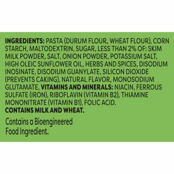 Enriched Macaroni Product [semolina And Durum Flour (wheat), Niacin, Ferrous Sulfate (iron), Thiamin Mononitrate (vitamin B1), Riboflavin (vitamin B2), Folic Acid], Maltodextrin (corn, Potato), Corn Starch, Whey Protein Concentrate (milk), Salt, Onion Powder, Sugar, Disodium Guanylate, Disodium Inosinate, Potassium Chloride, Hydrolyzed Soy Protein, Natural Flavor, High Oleic Sunflower Oil, Soybean Oil, Spices And Herbs, Skim Milk Powder, Extract Of Turmeric (for Color).