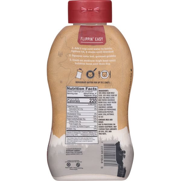 Flippin Easy: 1. Add 1 cup cold water bottle, tighten lid, & shake until blended. 2. Squeeze into hot, greased griddle. 3. Cook on medium – high heat until bubbles form and then flip.