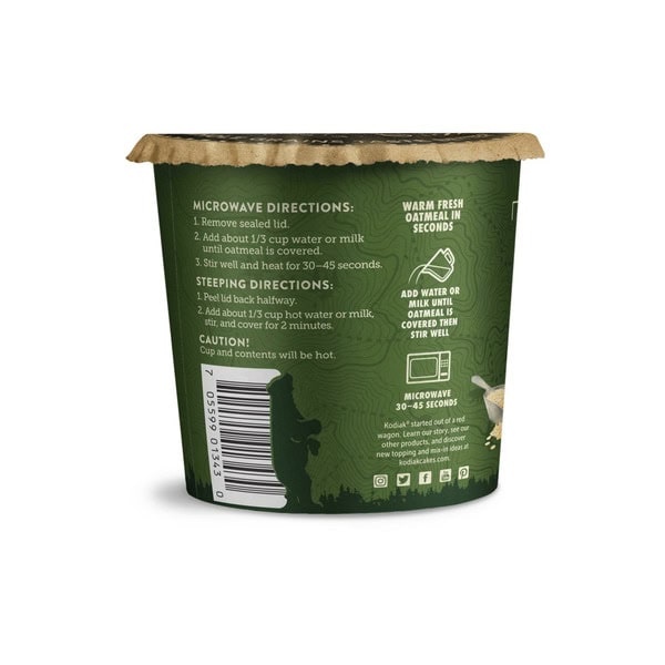Microwave Directions: 1. Remove sealed lid. 2. Add about 1/3 cup water or milk until oatmeal is covered. 3. Stir well and heat for 30-45 seconds. Steeping Directions: 1. Peel lid back halfaway. 2. Add about 1/3 cup hot water or milk, stir, and cover for 2 minutes. Warm fresh Oatmeal in seconds. Add water or milk until oatmeal is covered then stir well. Microwave 30-45 seconds. Caution! Cup and contents will be hot.