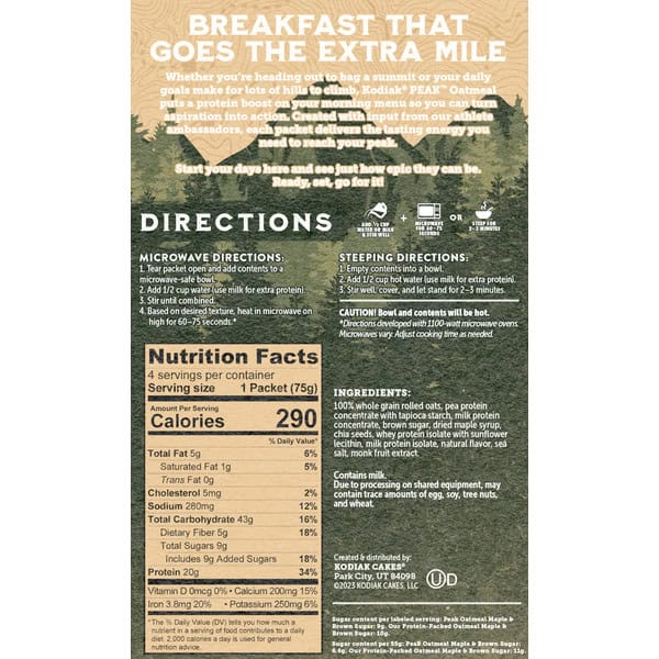 Directions: Add ½ cup water or milk & stir well. Microwave for 40-45 seconds or steep for 2-3 minutes. Microwave Directions: 1. Tear packet open and add contents to a microwave-safe bowl. 2. Add 1/3 cup water (use milk for extra protein). 3. Stir until combined. 4. Based on desired texture, heat in microwave on high for 40-45 seconds (Directions developed with 1100-watt microwave ovens. Microwaves vary. Adjust cooking time as needed). Add 1/3 cup water or milk & stir well. Microwave for 40-45 seconds. or steep for 2-3 minutes. Steeping directions: 1. Empty contents into a bowl. 2. Add 1/3 cup hot water (use milk for extra protein). 3. Stir well, cover, and let stand for 2-3 minutes. Caution! Bowl and contents will be hot.
