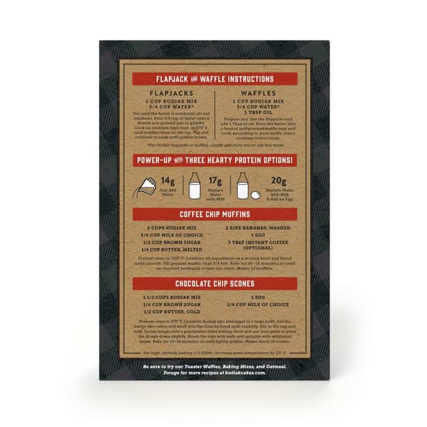 Flapjack and Waffle Instructions: Flapjacks: 1 cup Kodiak Mix; 3/4 cup water*. Pour mix into cup. Stir mix and water into a bowl until combined (do not overbeat). Pour 1/4 cup of batter onto a heated, greased pan or griddle. Cook on medium-high heat, or 375 degrees F, until bubbles form. Flip and continue to cook until golden brown. Waffles: 1 cup Kodiak mix 3/4 cup water*. 1 tsp oil. Prepare just like the flapjacks and add 1 Tbsp of oil. Pour the batter into a heated and greased waffle iron and cook according to your waffle irons cooking instructions.