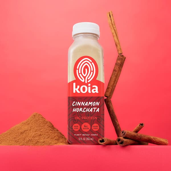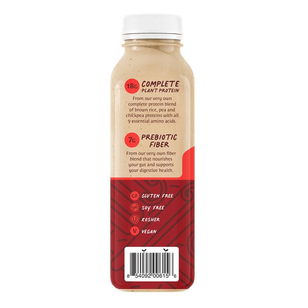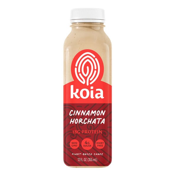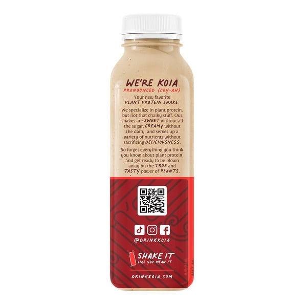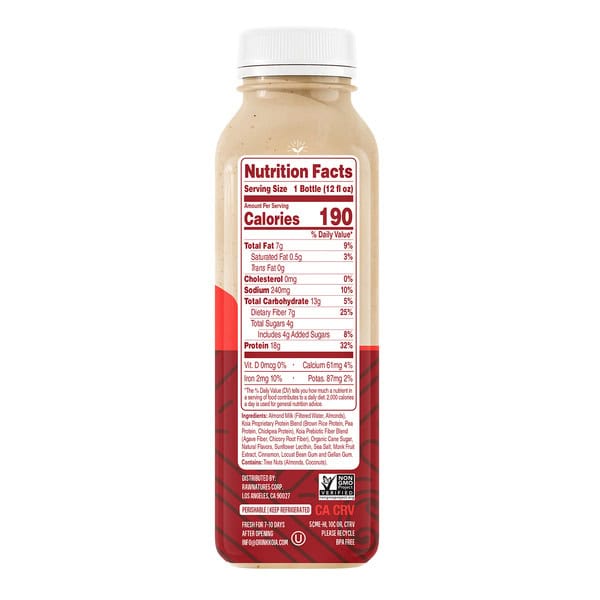 almond milk (filtered water, almonds), Koia proprietary protein blend (brown rice protein, pea protein, chickpea protein), koia prebiotic fiber (agave fiber, chicory root fiber), organic cane sugar, natural flavors, sunflower lecithin, sea salt, monk fruit extract, cinnamon, locust bean gum and gellan gum.