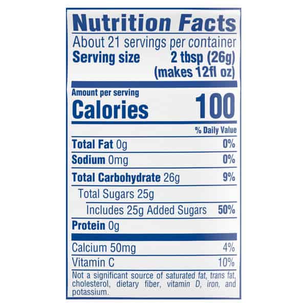 • Drink mix contains 35% less sugar than leading regular sodas (This product 25 g. sugar; Leading regular sodas 40 g. sugar per 12 fl. oz. serving)