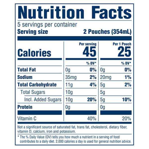 • Each juice pouch contains 55% less sugar than leading regular sodas (our product 16g total sugar, leading regular sodas 40g total sugar per 12 fl. oz. serving)