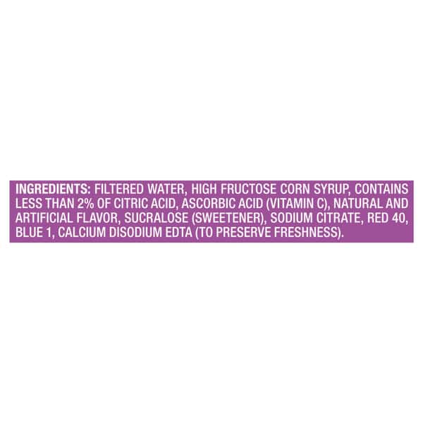 Filtered Water, High Fructose Corn Syrup, Contains Less Than 2% Of Citric Acid, Ascorbic Acid (vitamin C), Natural And Artificial Flavor, Sucralose (sweetener), Sodium Citrate, Red 40, Blue 1, Calcium Disodium Edta (to Preserve Freshness)